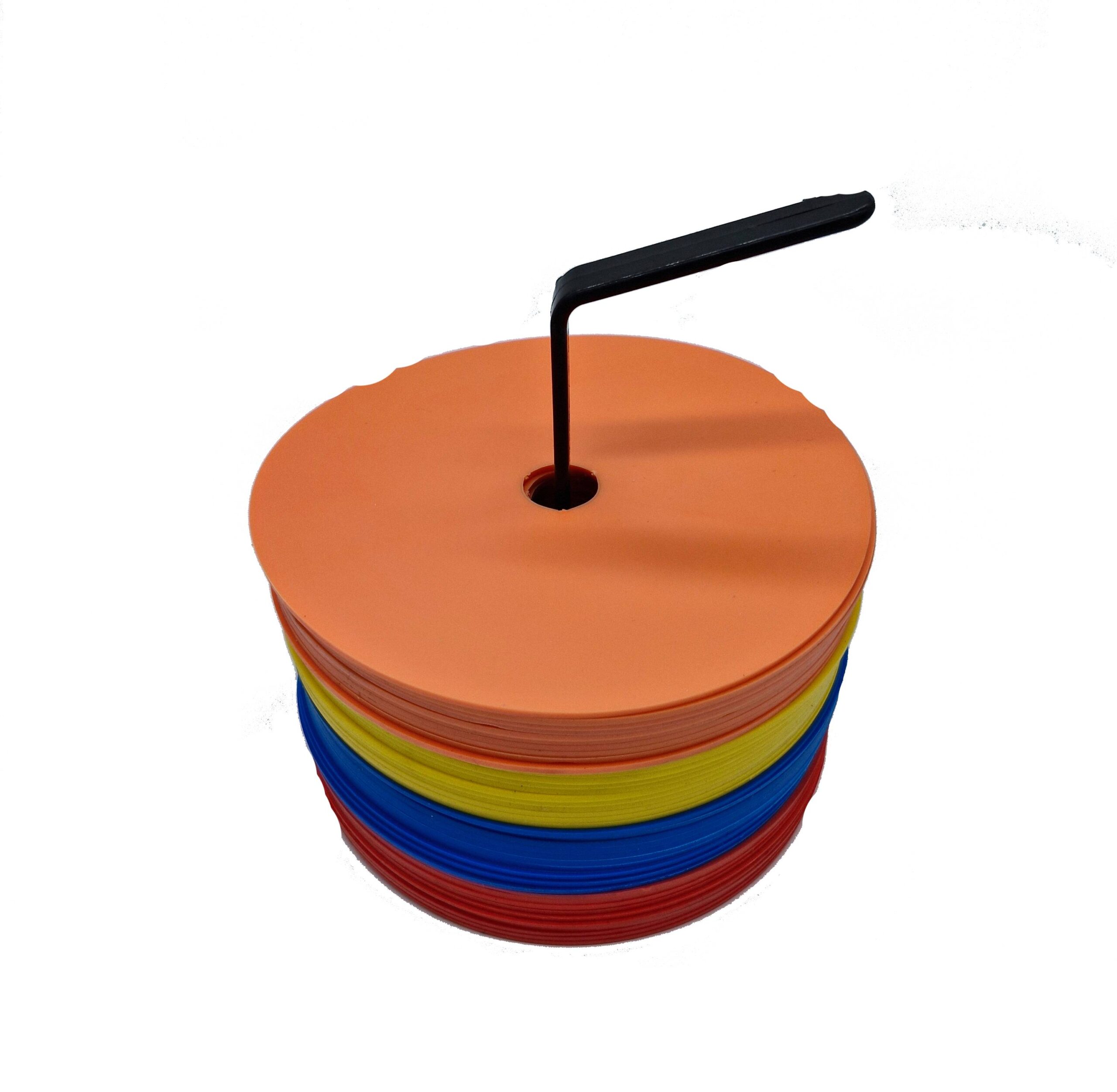Markeringskoner, 15 cm i mjukt PE-material, avsedda för att märka upp träningszoner. 10 st av respektive blå, röd, gul & orange. Plasthållare ingår.